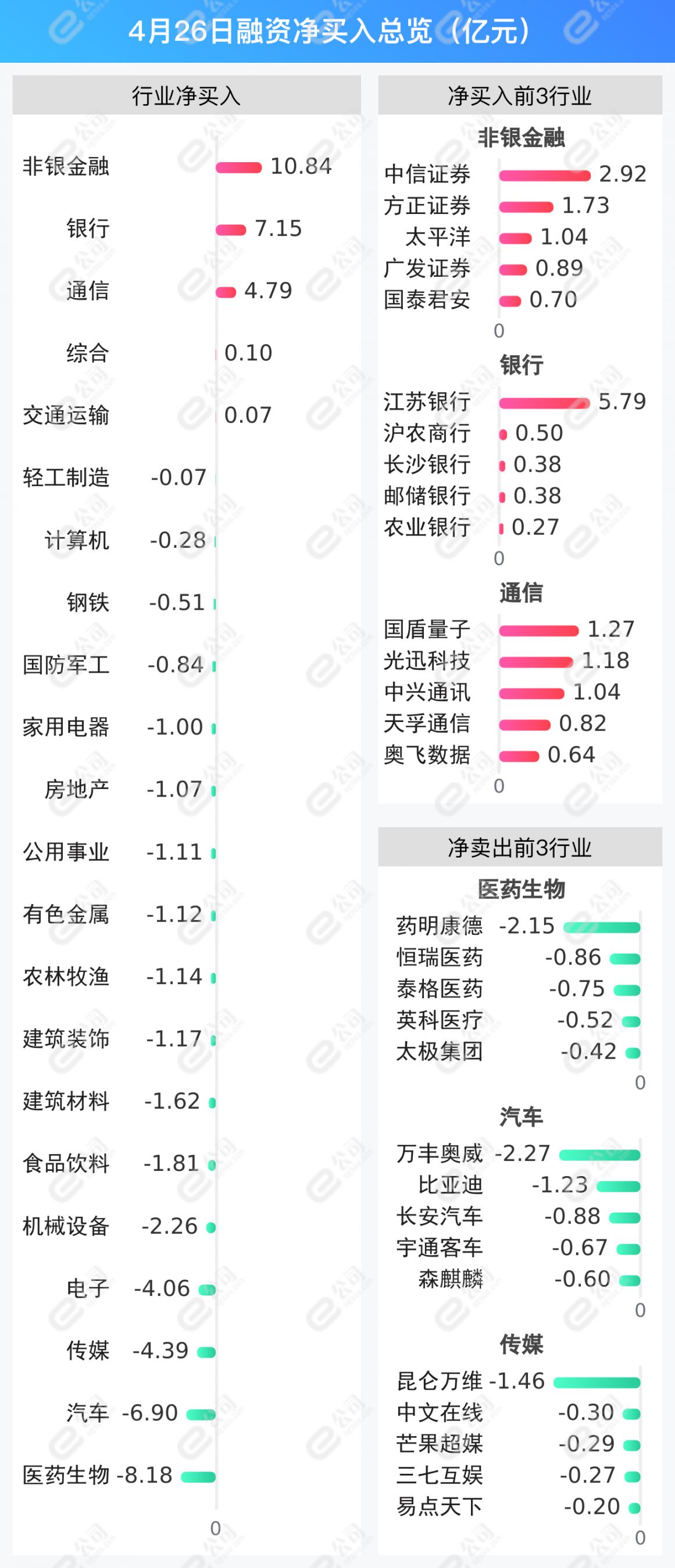 非银金融、银行、通信获融资净买入金额居前,分别为10.84亿元、7.15亿元、4.79亿元。