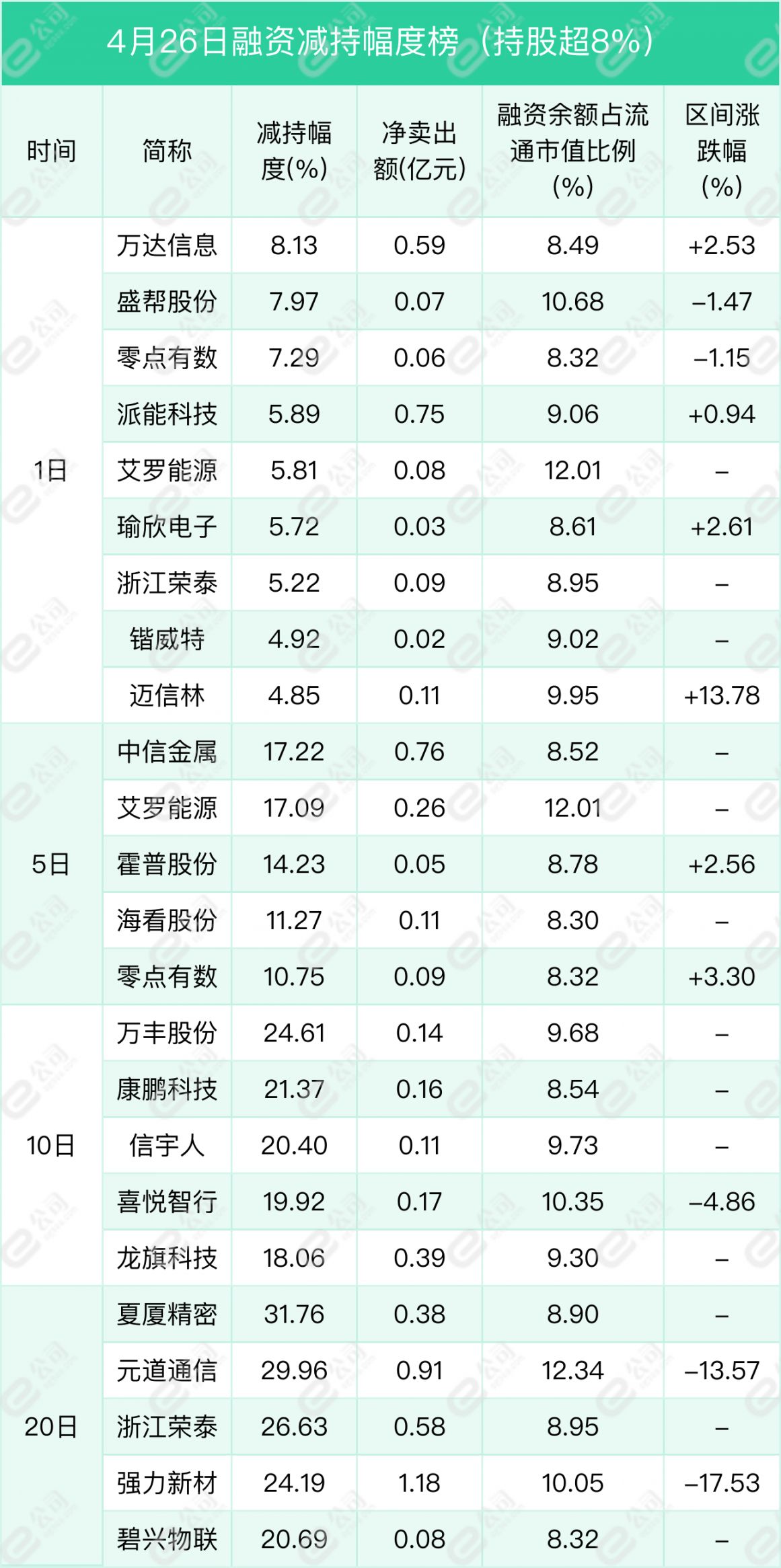 万达信息、盛帮股份、零点有数遭融资减持幅度居前,分别为8.13%、7.97%、7.29%。
