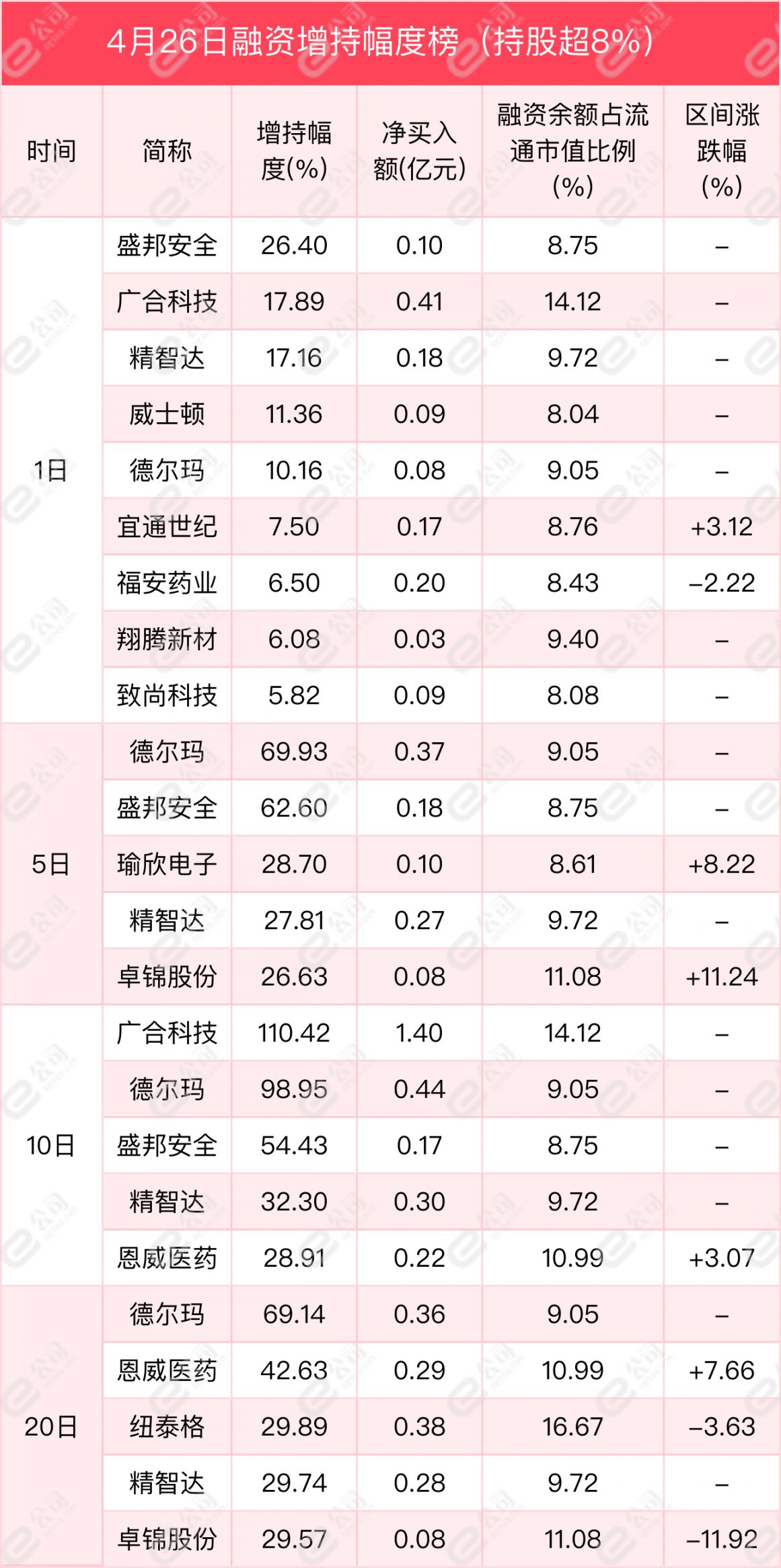 从增减持幅度来看,融资余额占流通股比例超8%的个股中,盛邦安全、广合科技、精智达获融资增持幅度居前,分别为26.4%、17.89%、17.16%。