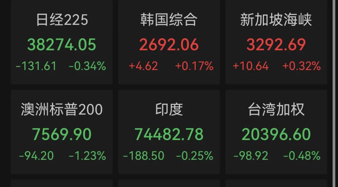 此外,澳洲标普200指数跌1.23%报7569.90点;新西兰标普50指数跌0.75%报11867.58点;韩国股市因节假日休市。