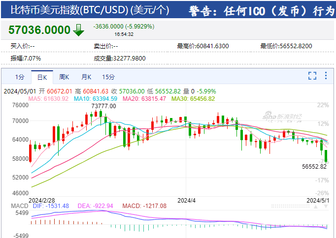北京时间5月1日,比特币跌破57000美元/枚,跌幅一度超6%。