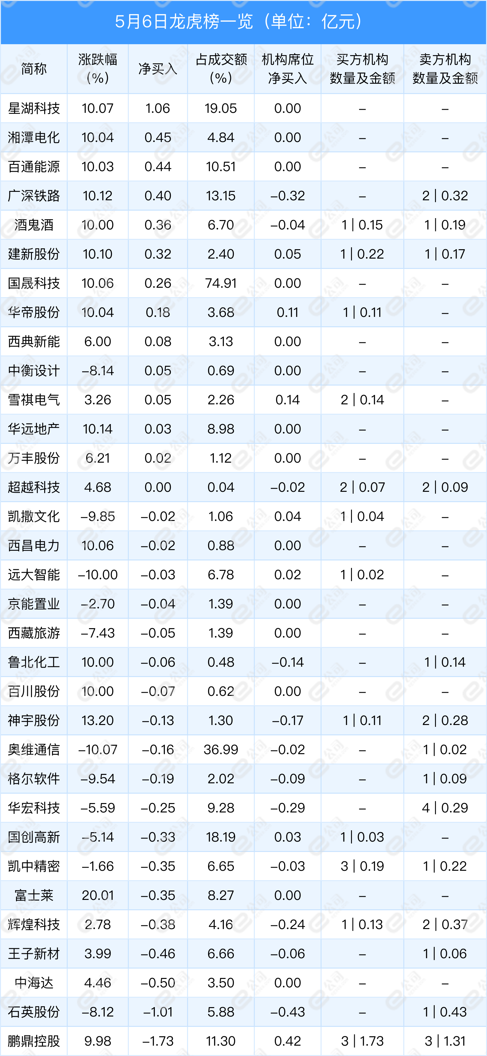 5月6日龙虎榜中机构及营业部席位资金净卖出2.45亿元,其中净买入的个股有14只;净卖出的个股有19只。净买入金额居前的个股分别是星湖科技、湘潭电化、百通能源等,净买入金额占当日成交额比例达19.05%、4.84%、10.51%。