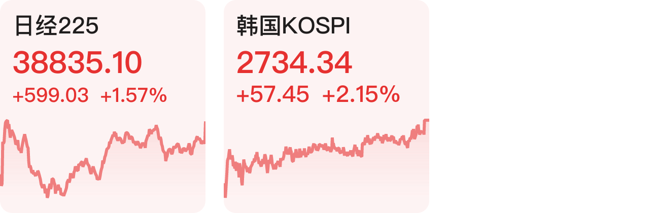 日经225指数涨1.57%,韩国KOSPI指数涨2.15%。