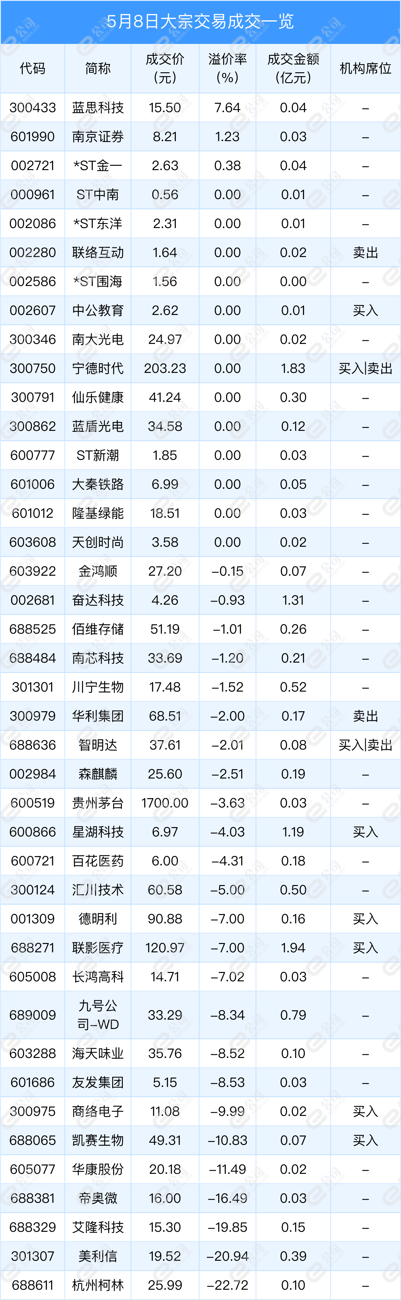 根据沪深交易所最近公布,两市5月8日共41只个股出现大宗交易,成交额为11.11亿元。其中溢价成交3只,平价成交13只,折价成交25只。