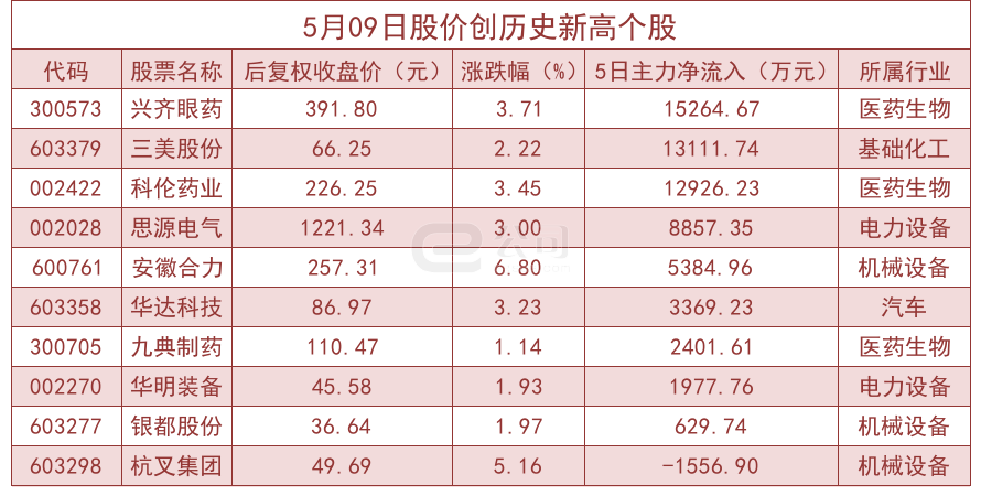 5月09日股价创历史新高个股一览