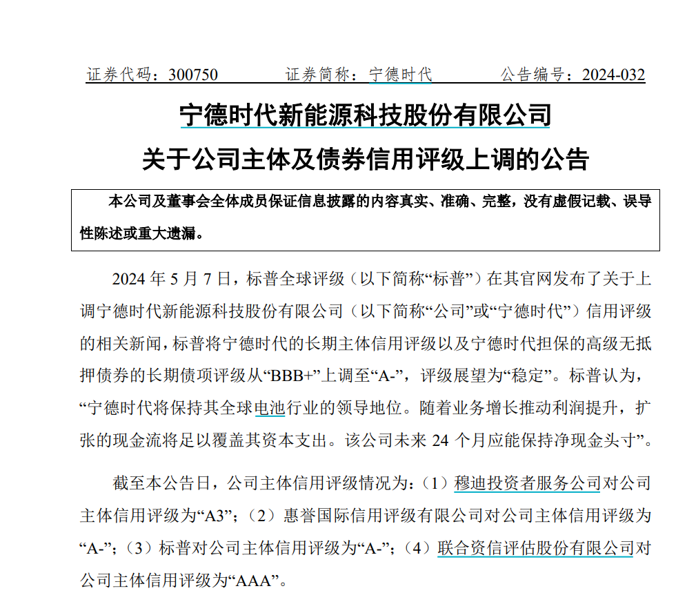 5月9日,宁德时代(300750)披露公告,5 月 7 日,标普全球评级(以下简称“标普”)在其官网发布了关于上调宁德时代信用评级的信息。标普将宁德时代的长期主体信用评级以及宁德时代担保的高级无抵押债券的长期债项评级从“BBB+”上调至“A-”,评级展望为“稳定”。