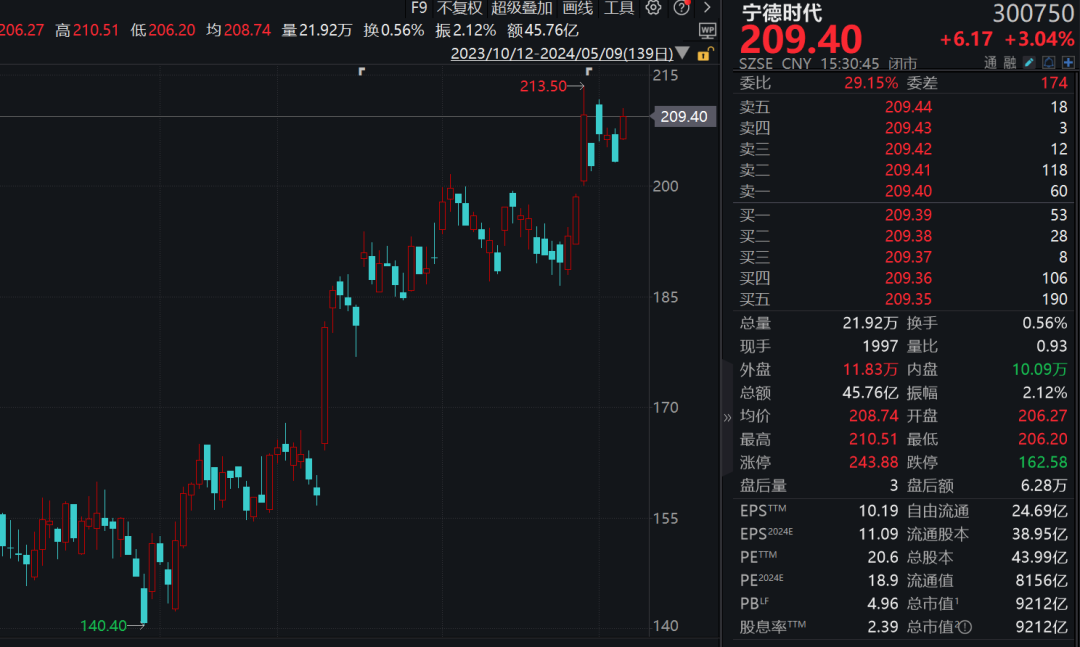 相关数据显示,5月9日宁德时代全天成交17.73亿元,成交净买入1.47亿元,为连续第8日净买入,其间该股获深股通累计成交158.45亿元,合计净买入28.58亿元。截至5月9日收盘,宁德时代报收209.40元,涨3.04%。