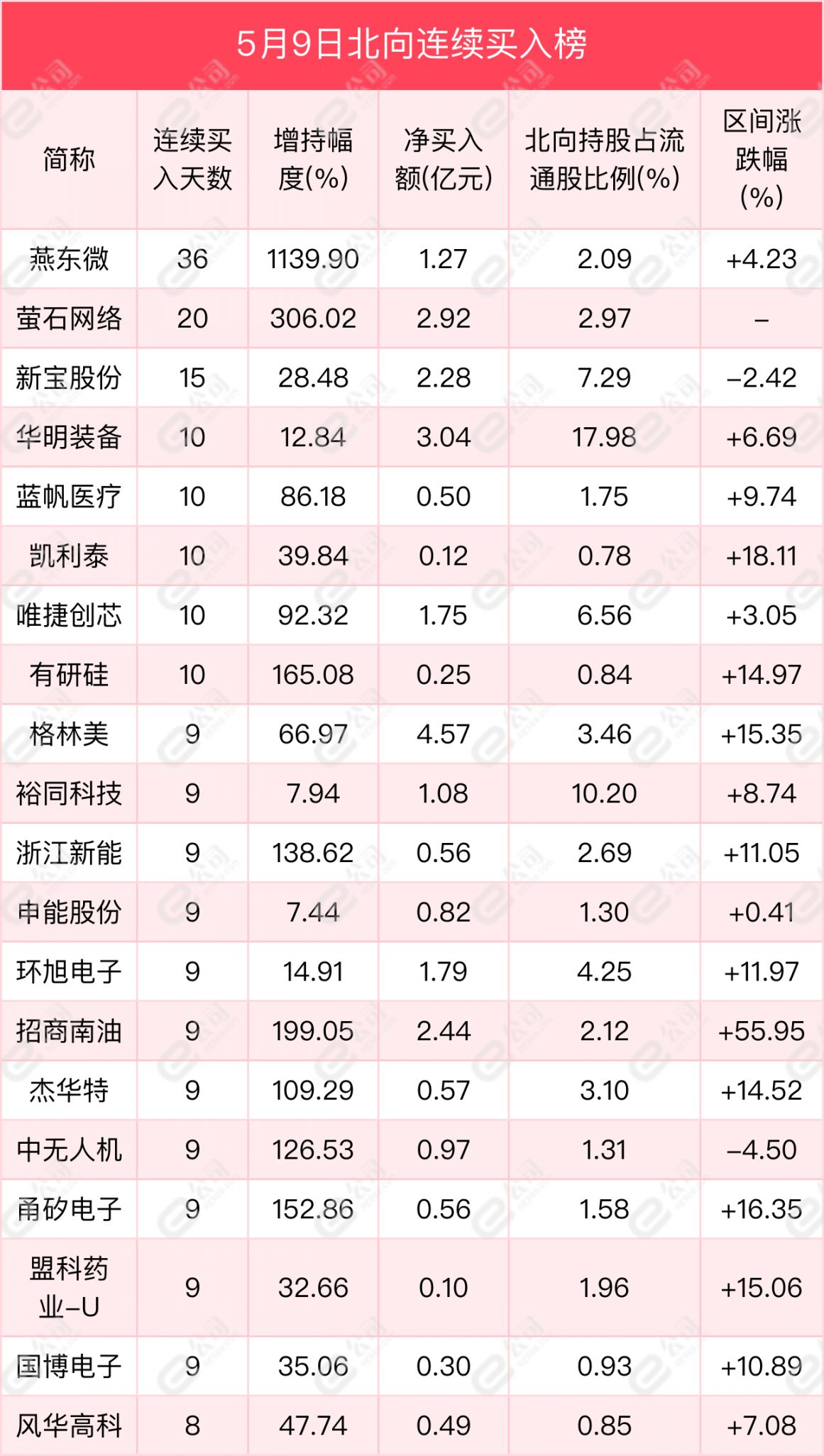 从连续买卖来看,燕东微、萤石网络、新宝股份获北向资金连续净买入天数居前,分别为36天、20天、15天,期间净买入额分别为1.27亿元、2.92亿元、2.28亿元,期间增持幅度分别为1139.9%、306.02%、28.48%。