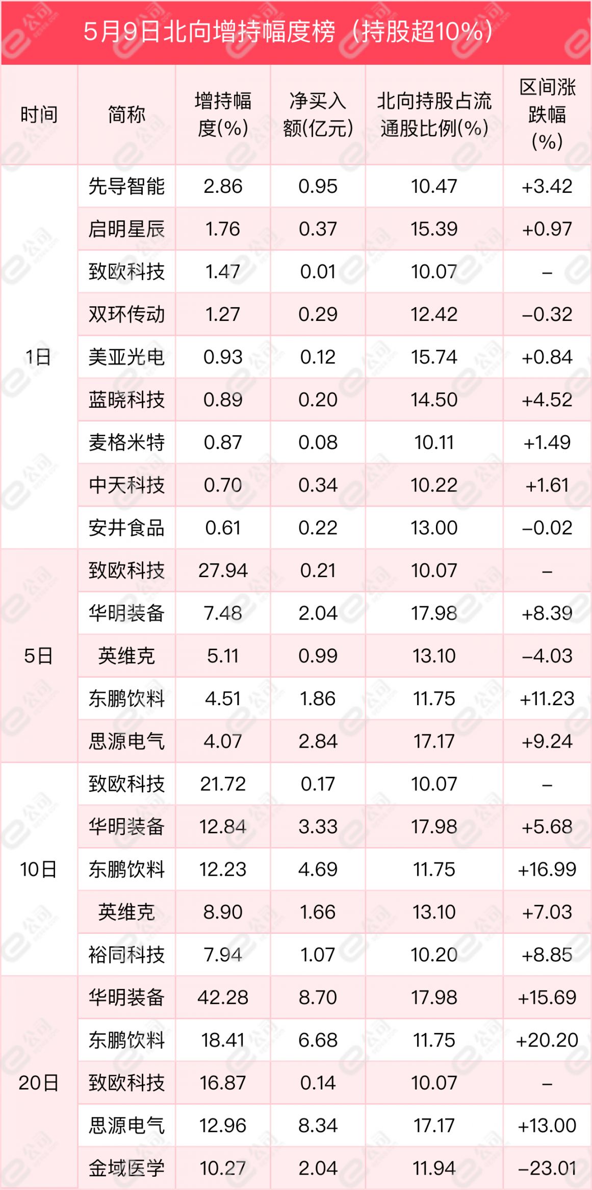 从增减持幅度来看,北向资金持股占流通股比例超10%的个股中,先导智能、启明星辰、致欧科技获北向资金增持幅度居前,分别为2.86%、1.76%、1.47%。