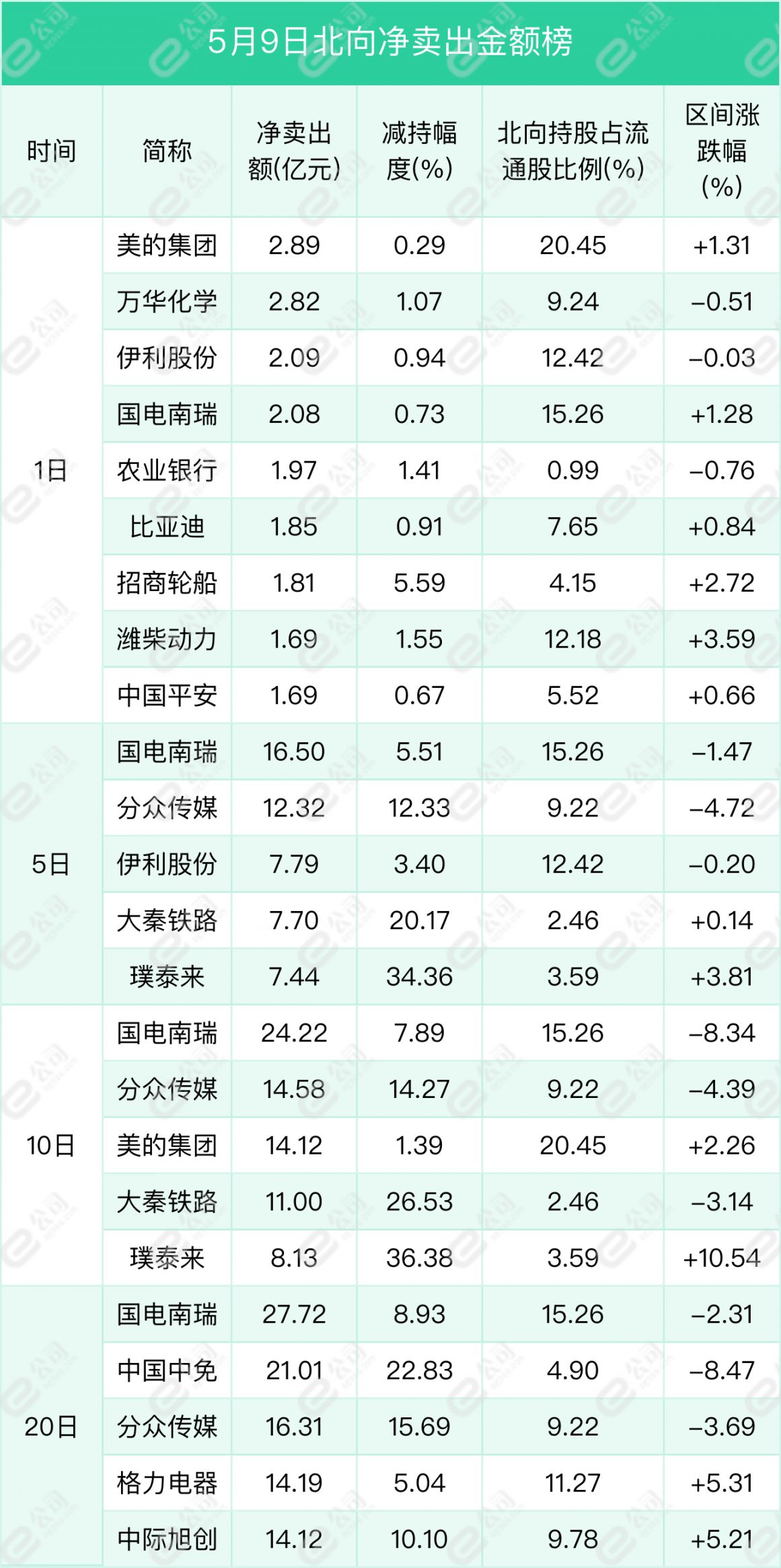 美的集团、万华化学、伊利股份遭北向资金净卖出金额居前,分别为2.89亿元、2.82亿元、2.09亿元,减持幅度分别为0.29%、1.07%、0.94%。