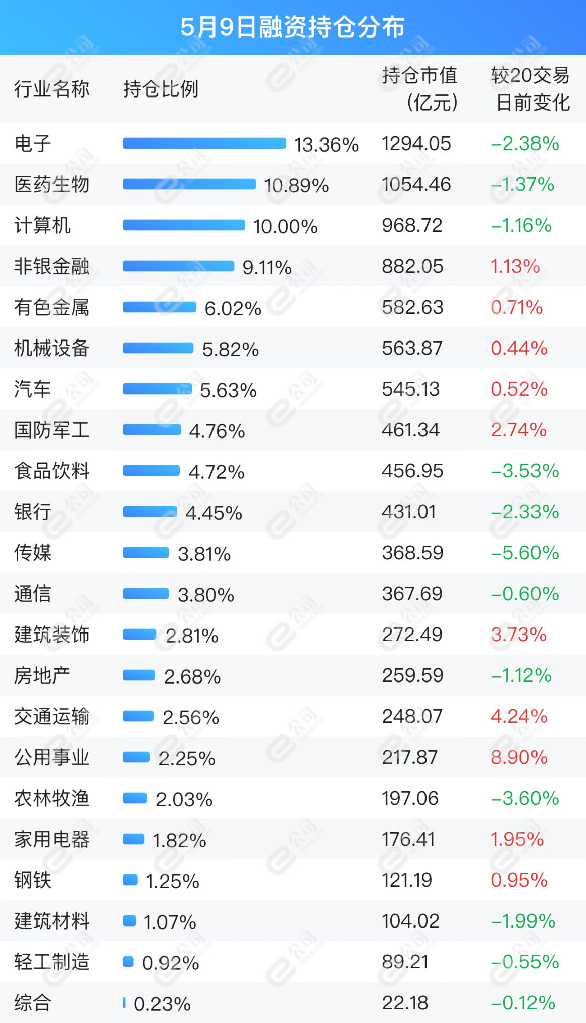 e公司数据统计显示,截至5月9日,融资持仓市值前五行业为电子、医药生物、计算机、非银金融、有色金属,占持仓总市值49.38%。