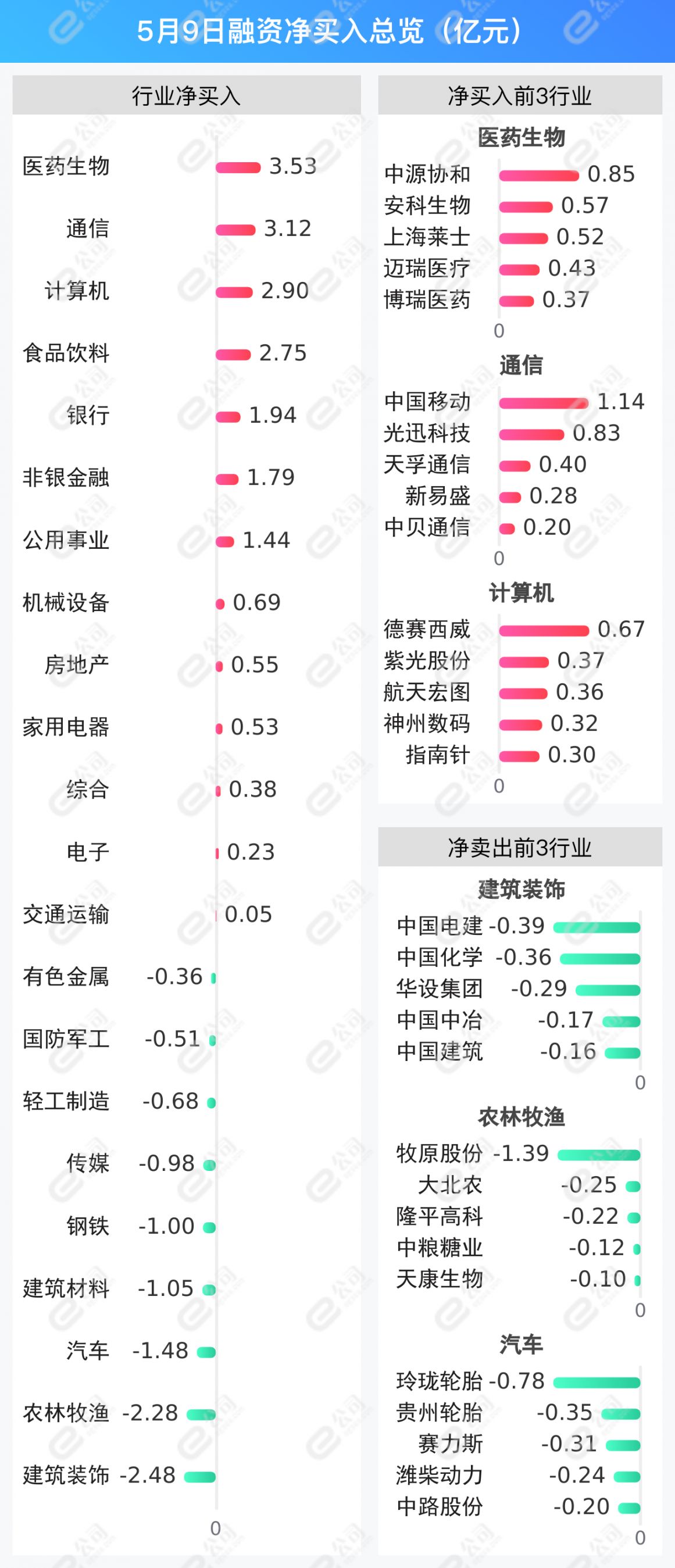 医药生物、通信、计算机获融资净买入金额居前,分别为3.53亿元、3.12亿元、2.9亿元。