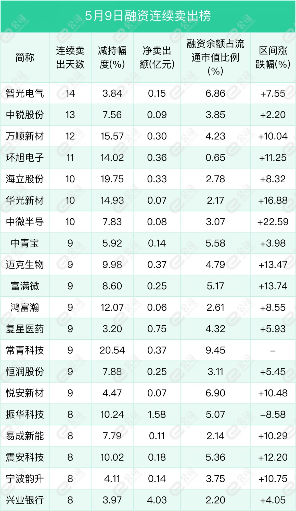 智光电气、中锐股份、万顺新材遭融资连续净卖出天数居前,分别为14天、13天、12天,期间净卖出额分别为0.15亿元、0.09亿元、0.3亿元,期间减持幅度分别为3.84%、7.56%、15.57%。