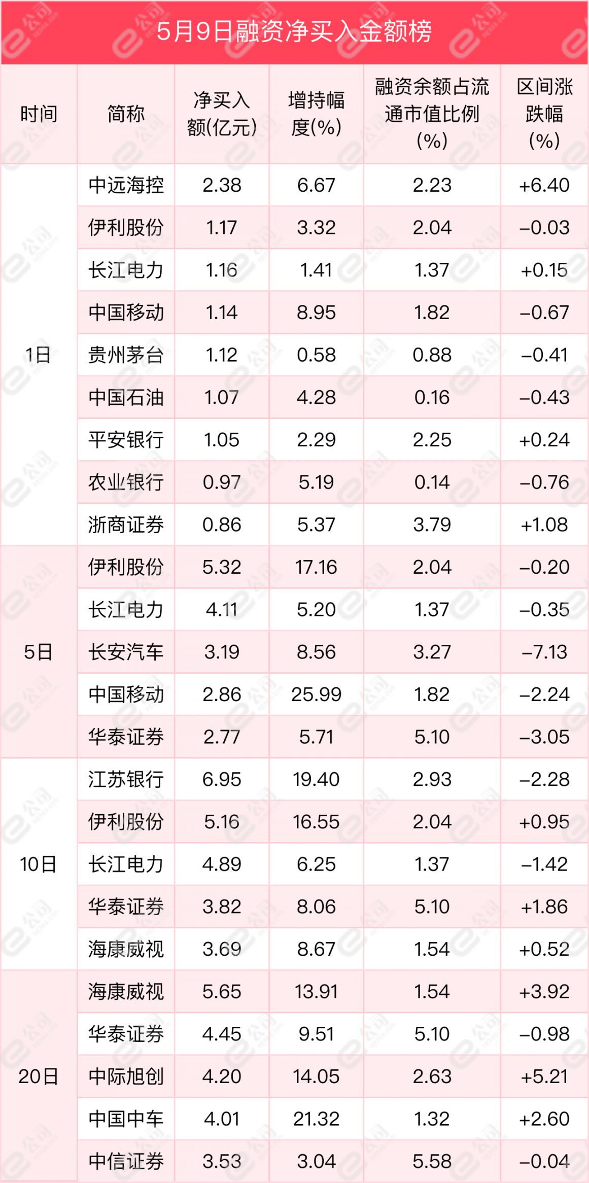 从买卖金额来看,中远海控、伊利股份、长江电力获融资净买入金额居前,分别为2.38亿元、1.17亿元、1.16亿元,增持幅度分别为6.67%、3.32%、1.41%。