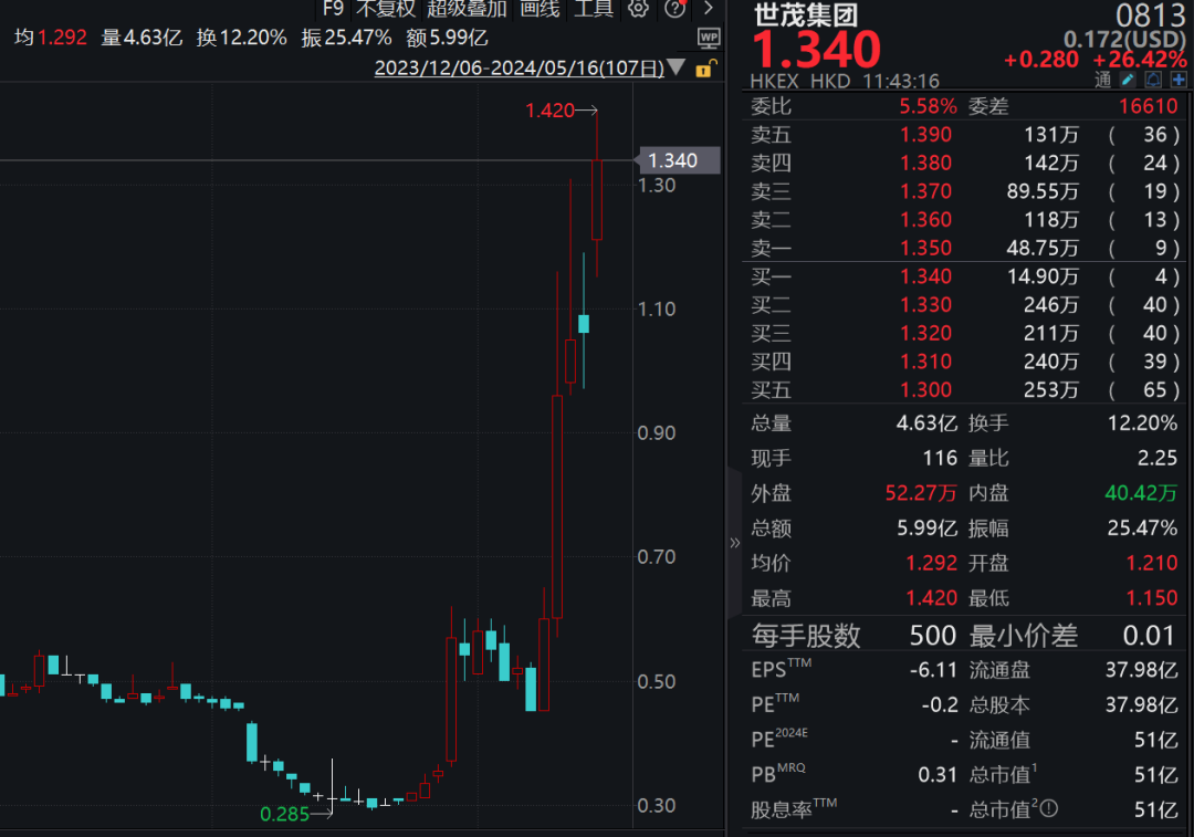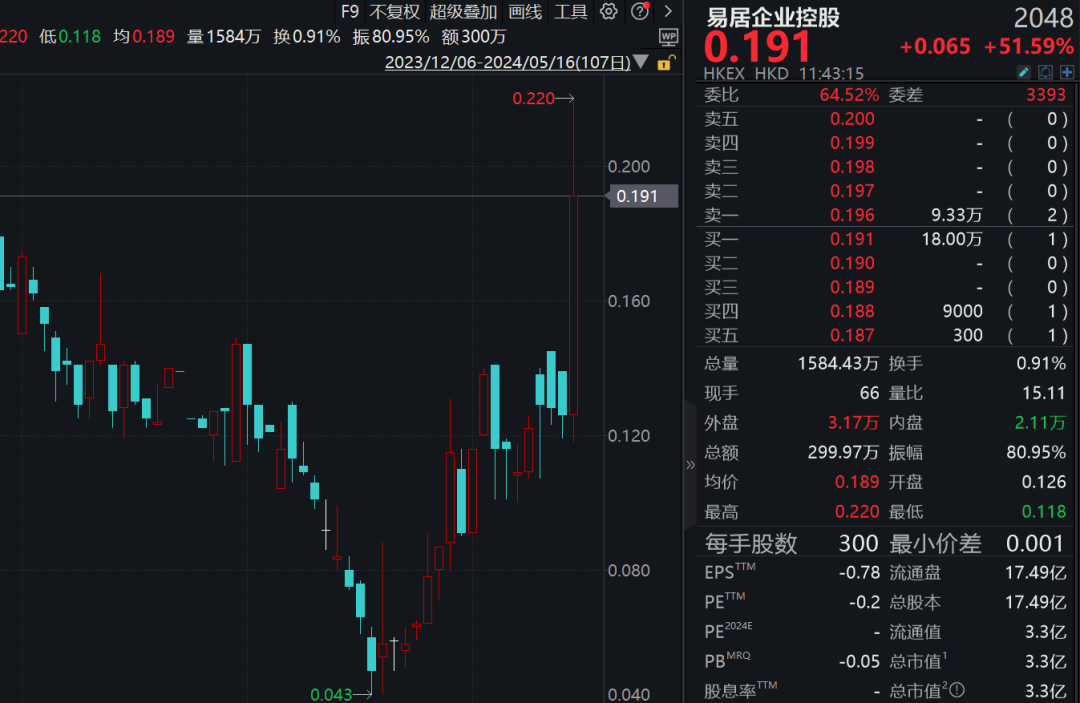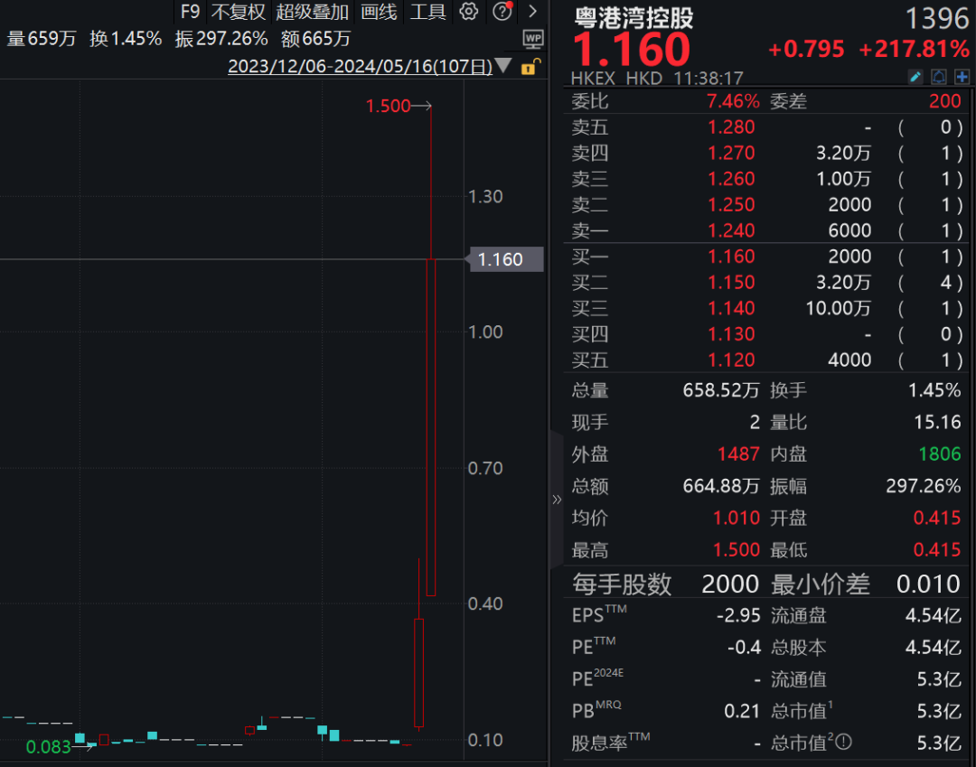 香港地产股涨势就更加猛烈,粤港湾控股在昨日暴涨315%后,今日盘中再度飙升,盘中一度涨超300%。如果按今天盘中最高1.5港元/股计算,较两个交易日前(5月13日)的收盘价0.088港元/股,最高涨超16倍。