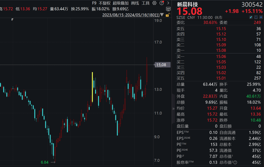 低空经济早间放量高开高走,板块指数盘中一度涨逾2%。新晨科技盘初一度垂直拉升,股价触及20%涨停,创9个月来新高,开盘不到10分钟成交就超过昨日全天成交;胜蓝股份、长源东谷等涨停或涨超10%。