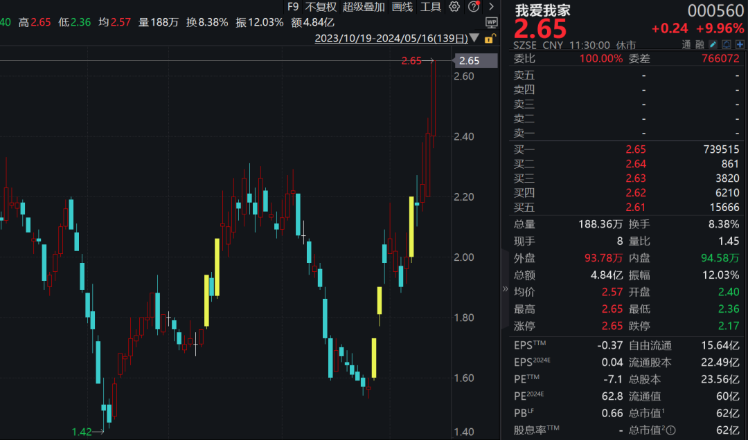 我爱我家开盘仅约7分钟就直线拉涨停,股价创8个月来新高,近3周来4度涨停,累计大涨69%;荣盛发展、合肥城建等也均强势涨停。