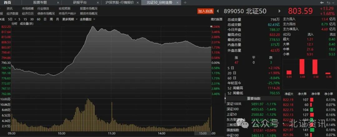 成交抢眼,北证50指数今日总成交额为82.43亿元,为5月份以来首次突破50亿元,并创出3月18日以来的成交额新高。
