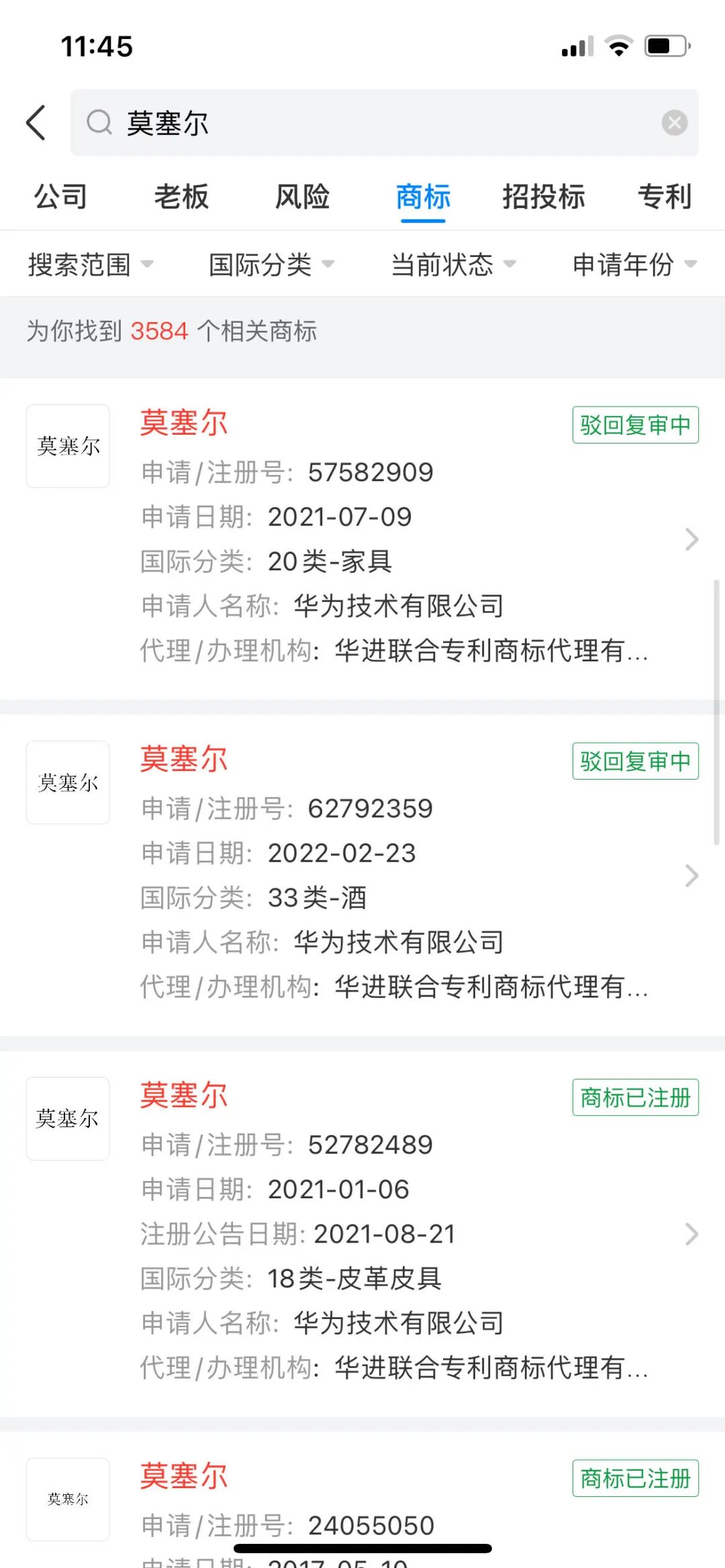 商标信息显示,华为早在2014年便注册了“莫塞尔”商标,该商标涉及广告销售、教育娱乐、皮革皮具、酒、家具、烟草烟具、网站服务、服装鞋帽、方便食品等。