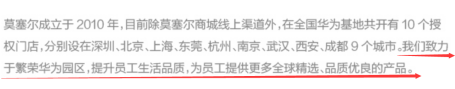 另外,莫塞尔官网还显示,莫塞尔成立于2010年,目前除莫塞尔商城线上渠道外,在全国华为基地共开有10个授权门店,分别设在深圳、北京、上海、东莞、杭州、南京、武汉、西安、成都9个城市,“我们致力于繁荣华为园区,提升员工生活品质,为员工提供更多全球精选、品质优良的产品”。