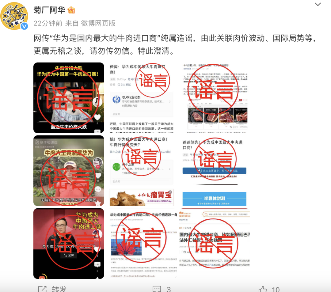 近日,网传“华为是国内最大的牛肉进口商”,对此,6月14日上午,华为对外公开辟谣称,相关消息纯属造谣,莫塞尔是华为旗下品质生活平台,主要服务员工及家属,由此关联肉价波动、国际局势等,更属无稽之谈,请勿传勿信,特此澄清。