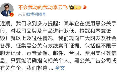 李云飞通过微博发文怒斥同行的恶意抹黑行为,他写道,“今年,汽车人提得最多的一个字就是‘卷’,卷技术、卷产品、卷价格、卷营销,甚至都要卷下限了,竞争惨烈抑或是令人发指的程度,是我入行近20年来,未曾见过的!如果是卷产品卷水平,那是要鼓掌!但要是卷下限,则令人不齿不屑!”