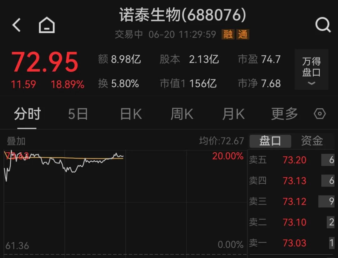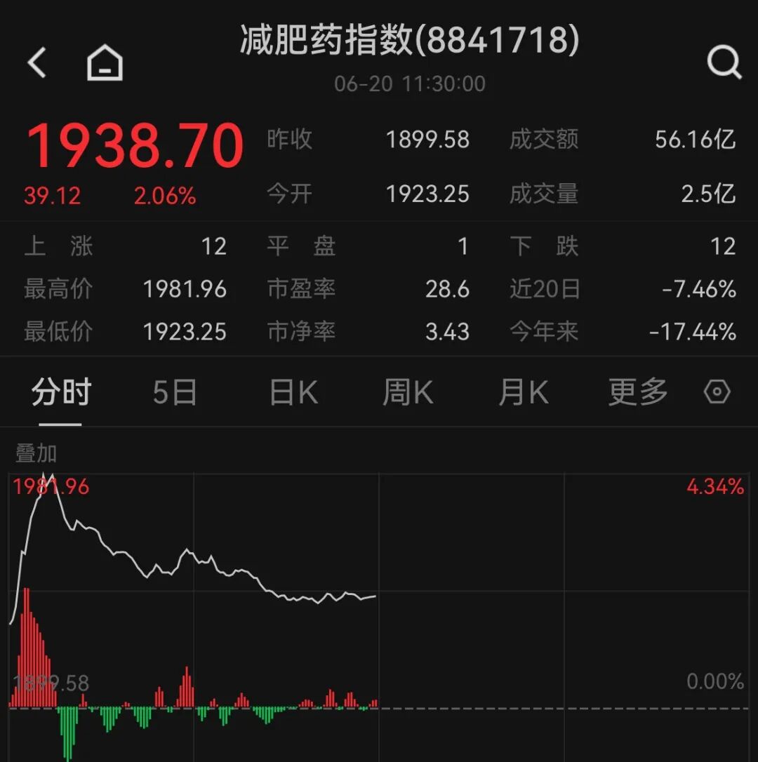 6月20日,A股减肥药概念开盘领涨,诺泰生物涨超18%,百花医药涨停、昊帆生物、常山药业、科源制药、奥锐特等跟涨。