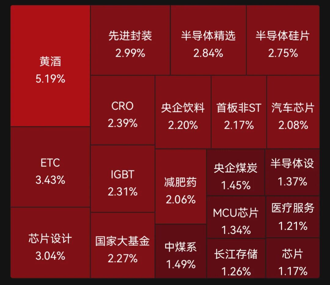 细分概念上,芯片设计、先进封装、汽车芯片、半导体硅片、半导体设备等板块集体大涨,减肥药板块强势拉升。