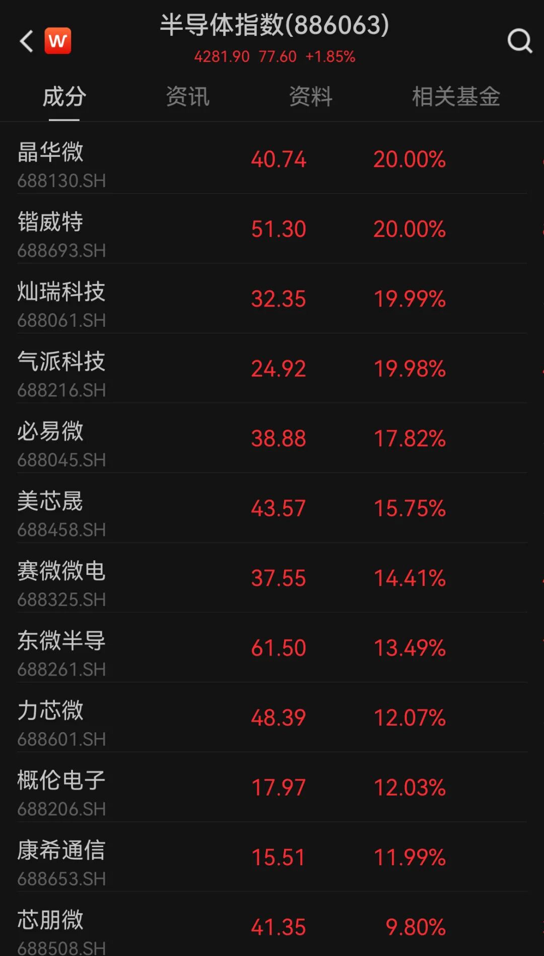 晶华微、锴威特、必易微集体20cm涨停。灿瑞科技、康希通信、东微半导、概伦电子、赛微电子、美芯晟等涨超12%。