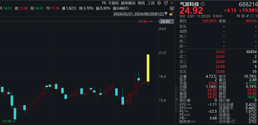 气派科技开盘一字涨停,连续两日封板。