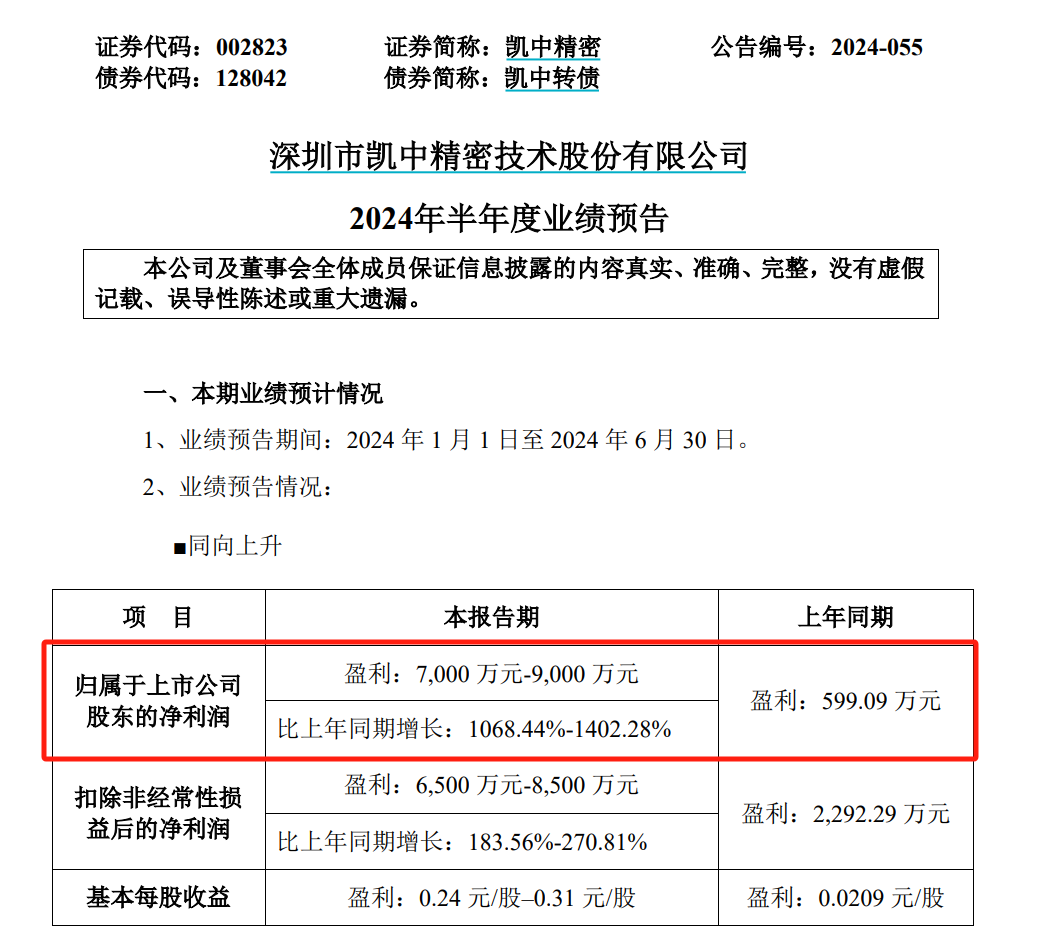 一季度业绩同比爆发式增长后,凯中精密(002823)再度对上半年盈利预喜。