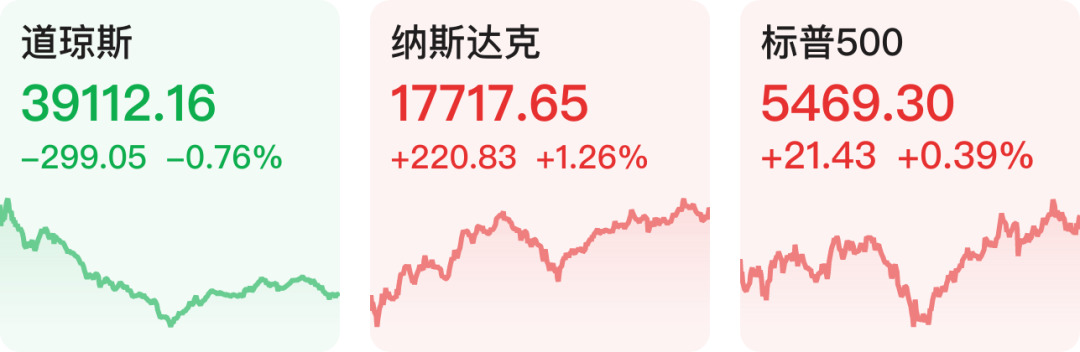 美股三大指数涨跌不一。截至收盘,道琼斯指数跌0.76%,纳斯达克指数涨1.26%,标普500指数涨0.39%。