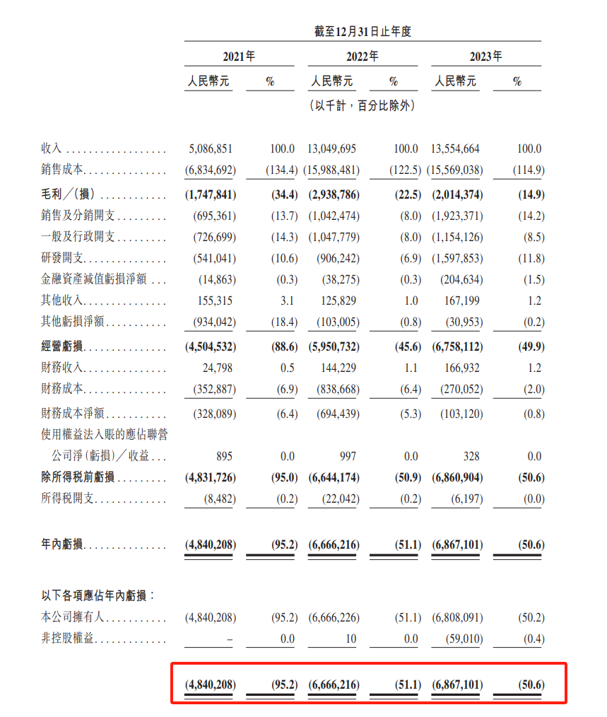 此外,自2021年至2023年报告期内,公司净利润亏损分别为48.4亿元、66.7亿元以及68.67亿元,三年净利润累计亏损183.77亿元。
