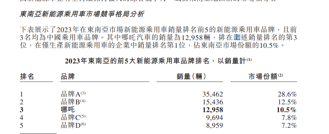 灼识咨询数据显示,2023年在东南亚市场新能源乘用车销量排名前五的企业中,前三名均为中国乘用车品牌,其中哪吒汽车的销量为12958辆排名第三,而在仅生产新能源乘用车的车企中销量排名第一,占东南亚市场份额的10.5%。