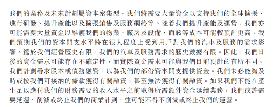 众所周知,新能源汽车属于资金密集型的“烧钱”行业,这一点合众新能源在上市申请书中坦言,公司未来的业务发展需要大量资金来支持全球扩张策略,提升产能和产品研发等。而公司的资本开支水平将在很大程度上受到用户对公司的汽车及服务的需求影响,由于公司经营历史有限,日后的资金需求可能存在不确定性,因此寻求股本或债务融资支撑业务的发展。