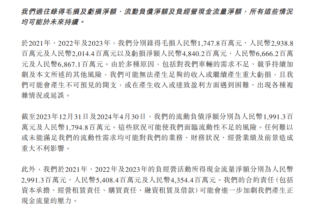 上市申请书透露,截至2023年12月31日至2024年4月30日,合众新能源的流动负债净额分别为人民币19.91亿元和17.95亿元,自2021年至2023年底,公司的负经营活动所得现金流净额分别为29.91亿元,54.08亿元和43.54亿元,这些状况都可能使公司面临流动性不足的风险以及产生正现金流量的压力。