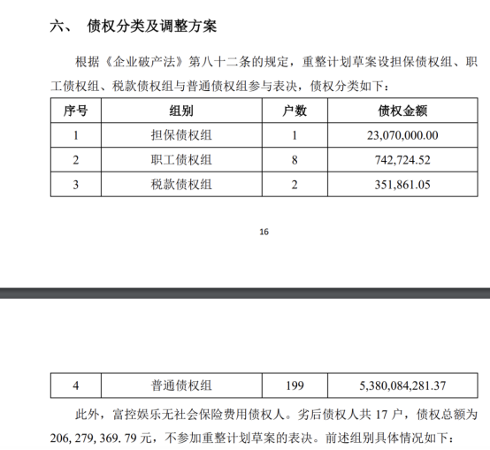 6月27日晚,修订后的富控娱乐《重整计划草案》公布。草案显示,富控娱乐的普通债权债权人共199户,债权总额53.8亿元。根据草案,富控娱乐普通债权清偿率约为7%,较初次表决的草案中的6.72%的清偿率稍有提升。