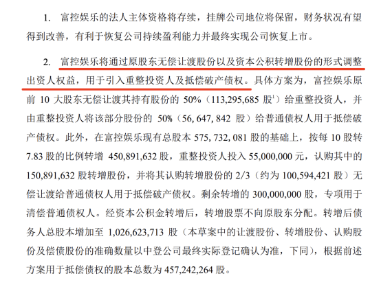 偿债股份来源包括资本公积金转增股本以及富控娱乐原股东无偿让渡的部分股份。预计偿还普通债权人的股数为4.57亿股,每股偿债价格为0.73元。