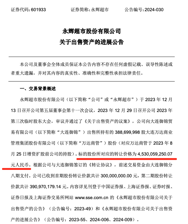 此前,永辉超市于去年12月宣布向大连御锦转让其所持大连万达商业管理集团股份有限公司(下称“万达商业”)股份3.88亿股,占万达商业总股本的1.43%,转让价格为45.3亿元。