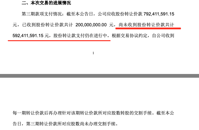 按照约定,股权转让款分八期支付,其中第三期的付款时间为6月30日。在款项未足额到账的情况下,上市公司表示:“截至本公告日,第三期转让价款所对应股数尚未办理交割手续。”