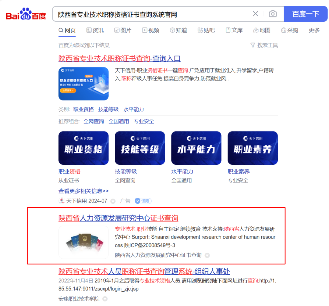 值得一提的是,记者通过网络以“陕西省专业技术职称资格证书查询系统官网”为关键词搜索发现,排在第一位的竟然是“陕西省人力资源发展研究中心证书查询”。以“陕西省专业技术人员资格证书管理系统”为关键词搜索,出来的也不是系统官网。
