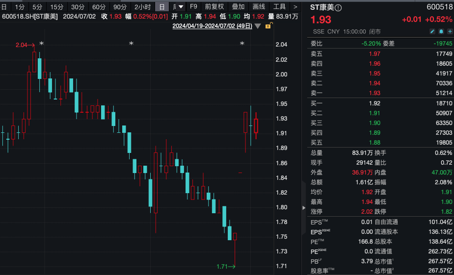 市场对ST康美撤销其他风险警示已有预期,并明显反映在了股价上。6月26日,ST康美召开董事会,同意向上交所提出撤销其他风险警示申请。6月27至28日,公司股价连续两日涨停,最新报收1.93元/股,市值267.57亿元。