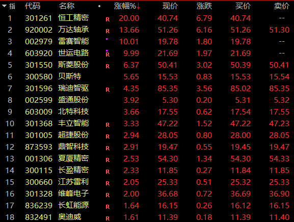 恒工精密开盘仅1分钟就垂直拉升,20%涨停,不到2分钟成交量就超过昨日全天成交量;雷赛智能也仅用约4分钟就快速封板,万达轴承等涨停或涨超10%。