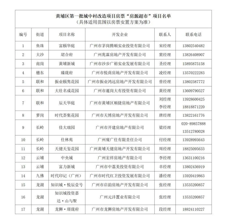 据悉,凡是选择房票安置的村民,均可进入该“房源超市”选购房屋,并在购买时使用房票进行结算。该名单将视具体情况进行动态调整,具体适用范围以各村房票安置实施方案为准。此外,首批纳入“房源超市”的楼盘,共有包括黄埔新城、中央城、富颐华庭在内的17个项目,遍布黄埔区海丝城、科学城、知识城三大片区,涉全区10个街道,配套都较为完善。