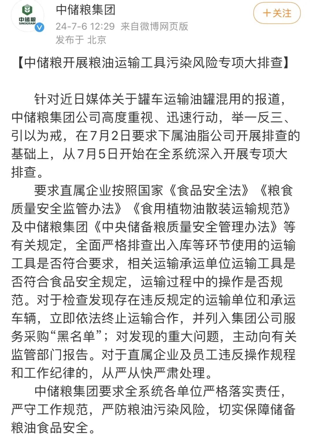7月6日,中国储备粮管理集团有限公司官方微博就罐车运输油罐混用事件发文回应: