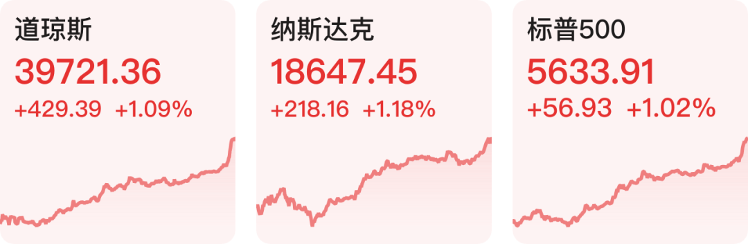 截至收盘,道琼斯指数涨1.09%,纳斯达克指数涨1.18%,标普500指数涨1.02%。