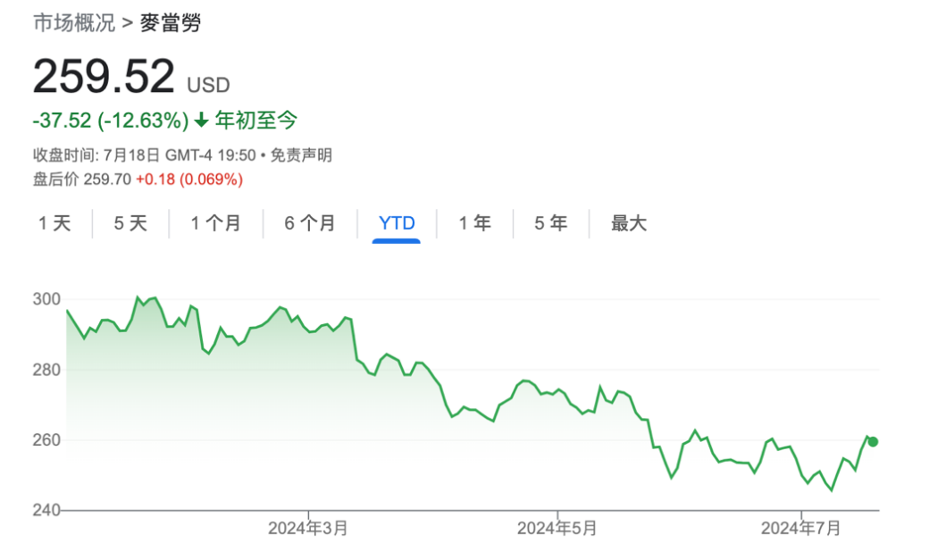营收不及预期与客户满意度最低的评分使得麦当劳的股价年初至今已跌超12%,远低于同期标普500指数近17%的涨幅。