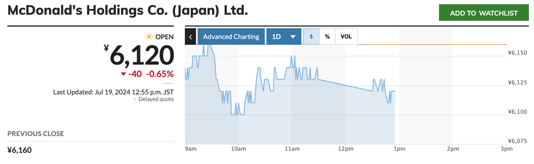 事件发生后,日本麦当劳控股有限公司在东京证券交易所股价短线跳水超1%,随后跌幅收窄。