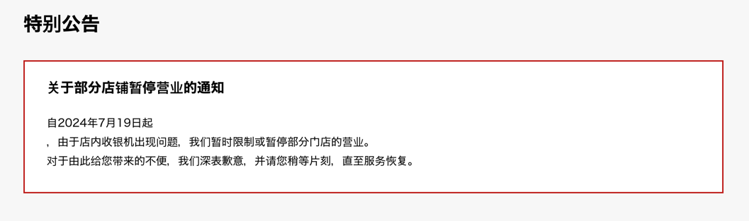 7月19日,麦当劳日本公司在全国约3000家门店中,约有30%由于收银系统问题而无法营业。麦当劳日本公司在其官网也发布了公告,表示由于店内收银机出现问题,暂停了部分门店的营业。