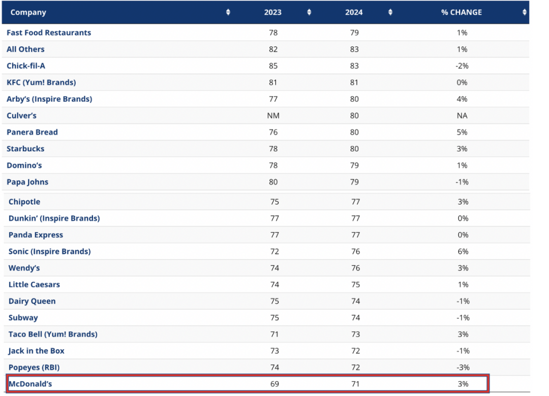 (ACSI大型餐厅分数调查截图,麦当劳垫底。来源:Theacsi)